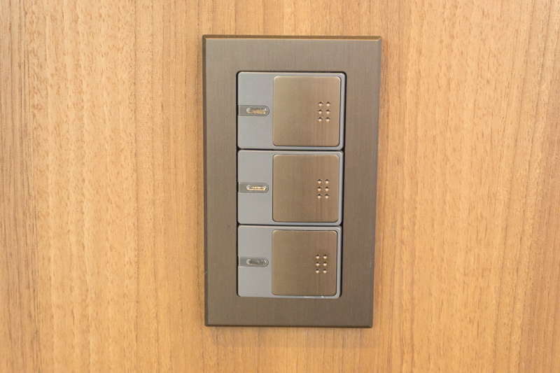 照明のスイッチも定番の白いものではなく濃い色で上品に。細かいところへの気遣いがさすが