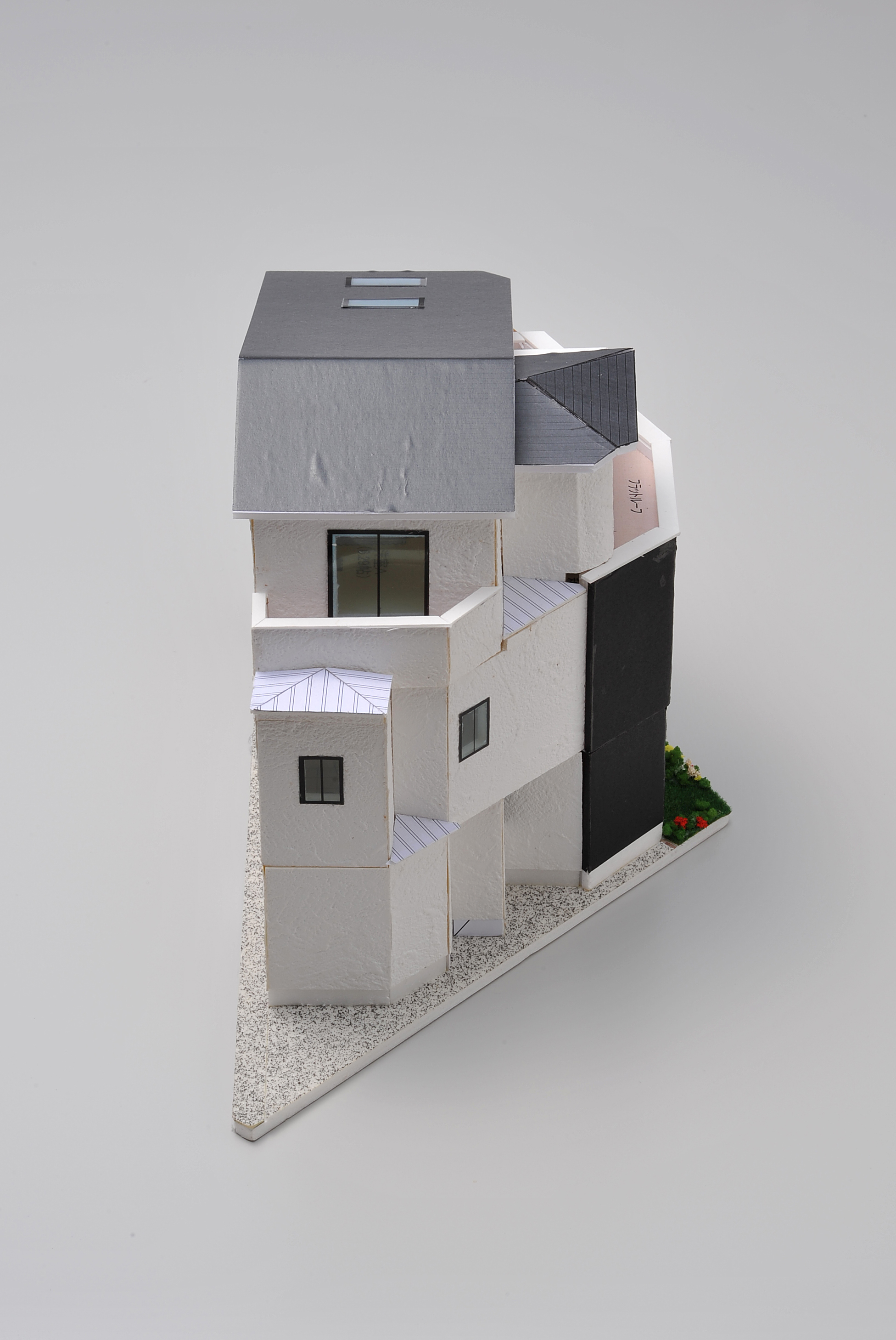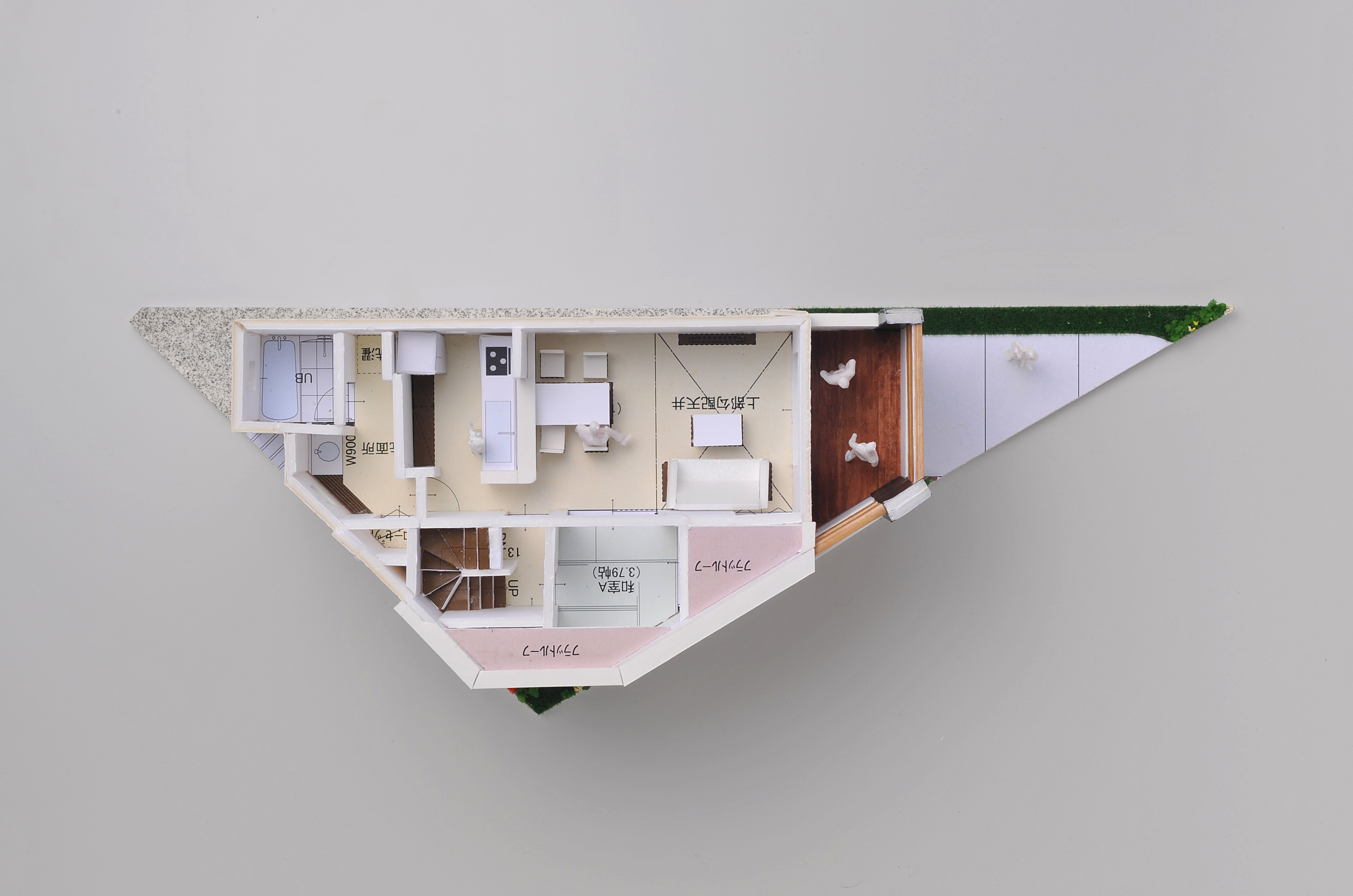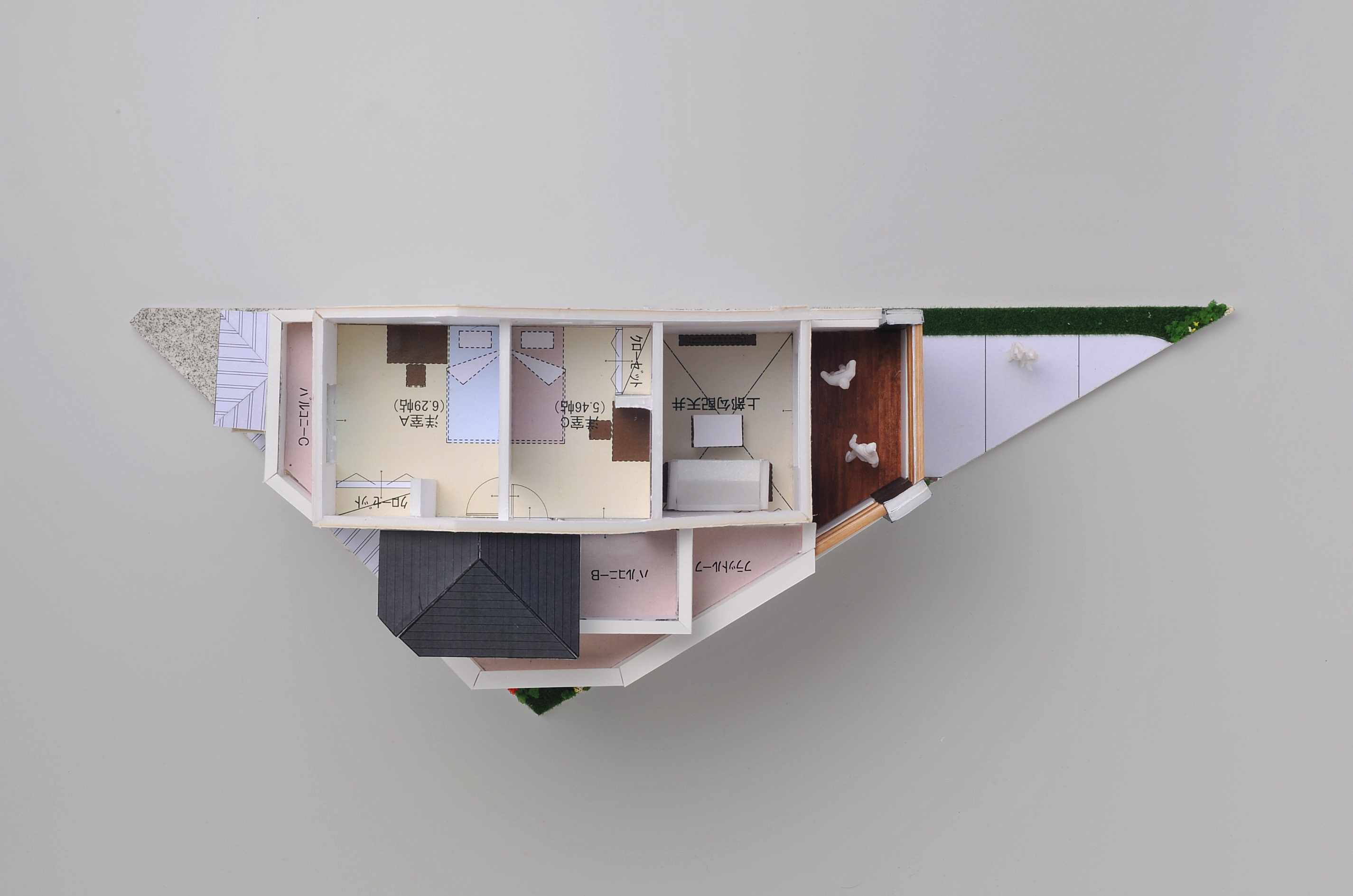 そう言われることも多いので、例えばこの三角形の土地、以前は自由設計だったので、3つのプラン例を用意していました!模型や間取りなど、いろいろイメージしやすい素材をつくっていたんです。よかったら見てみますか?」