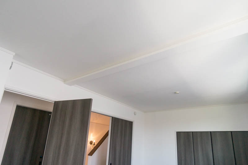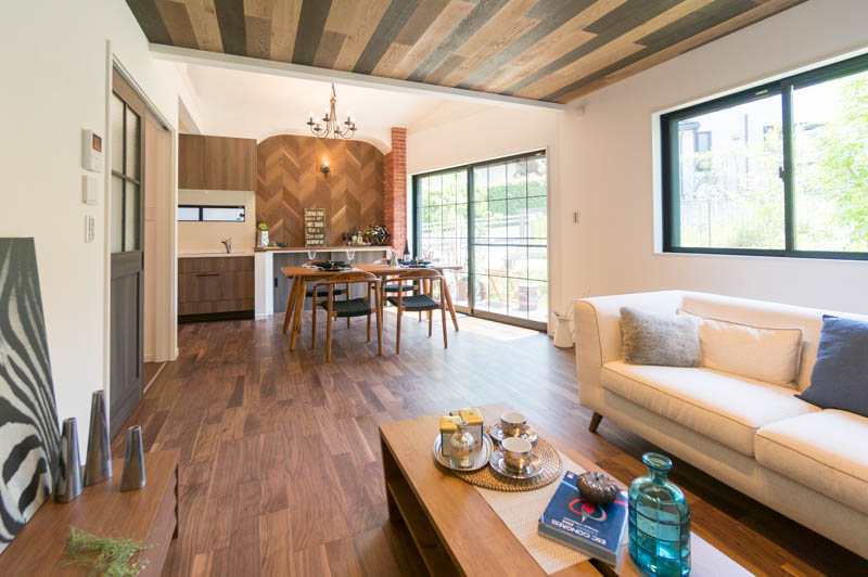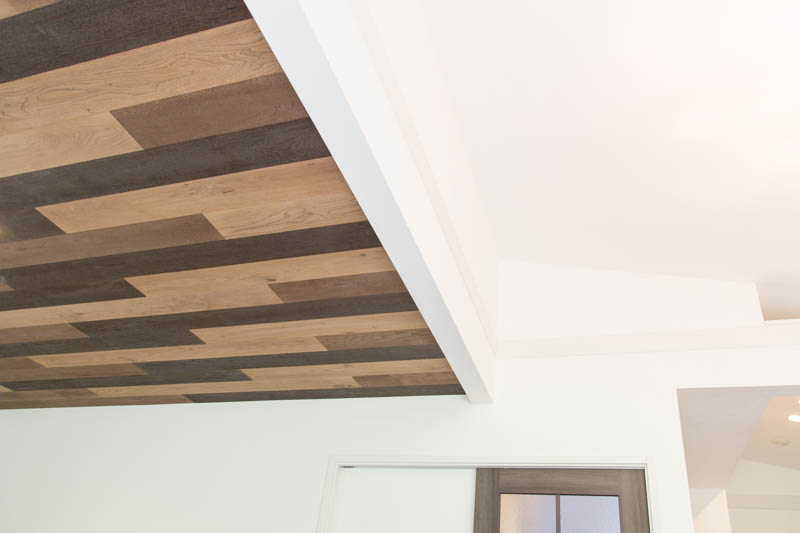 リビングの天井にはウッドパネルが貼られていて、単調になってしまいがちな天井もオシャレに。
