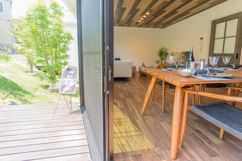ウッドデッキの周りも芝生になっていて、とっても開放的。