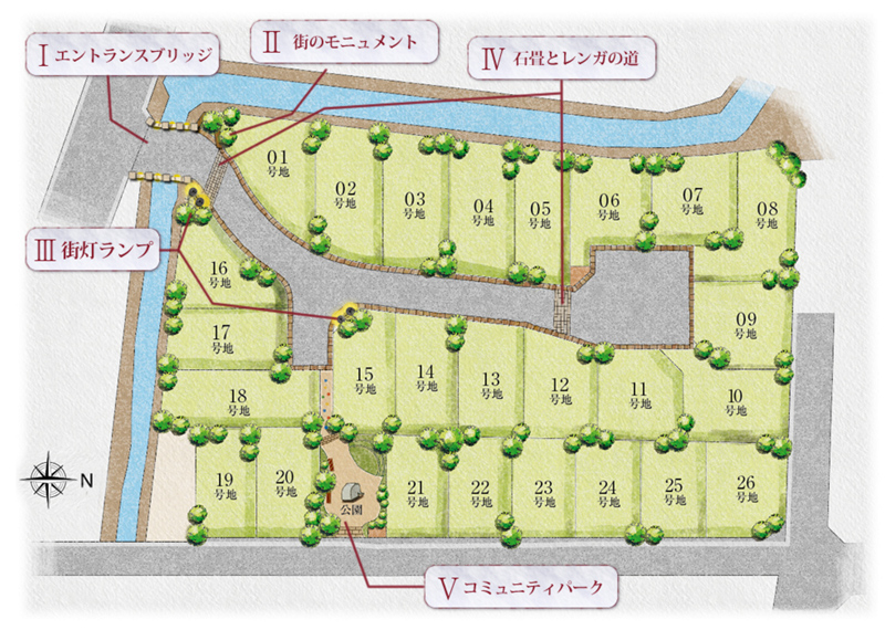 最終1邸の1号地は、エントランスブリッジを渡って正面(上の写真の左側)にあります。