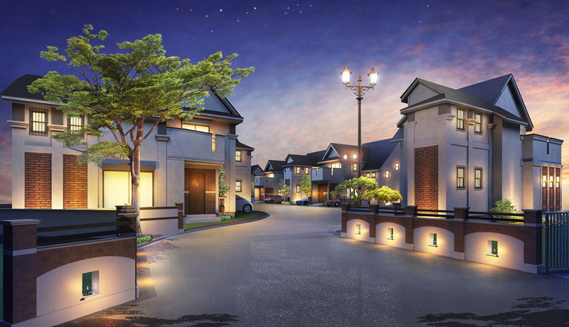 毎日が旅行気分!異国情緒あふれる赤レンガとランプ、石畳のまちが完成。クラシックなおうち最終1邸と夜のようすもご紹介【ひらつー不動産】