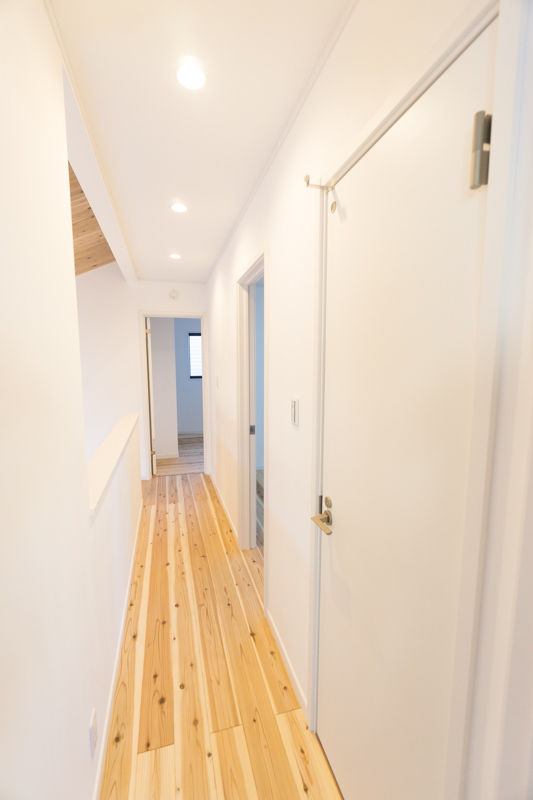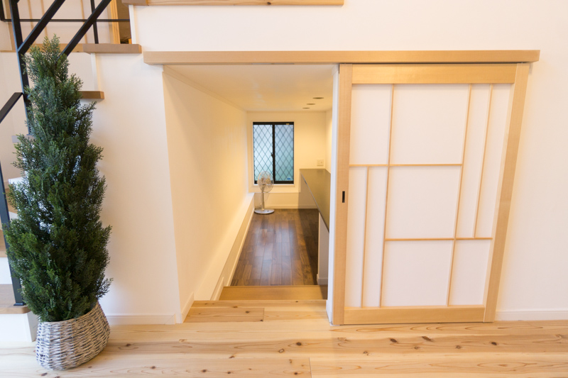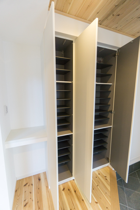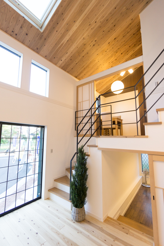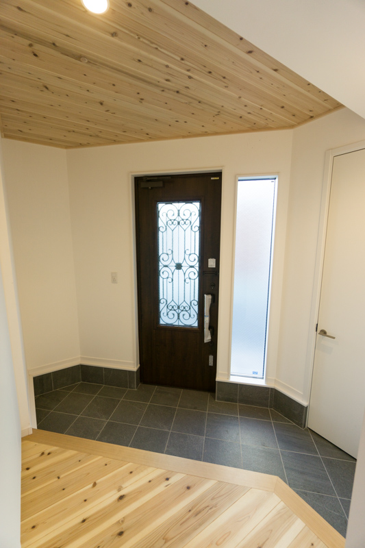 玄関は土間スペースが広く、採光窓があって明るいです。床と、天井にも杉の木材を使用しており、あたたかい印象。