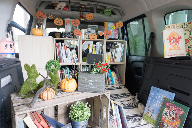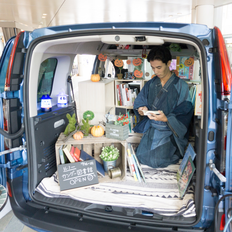 広さを実感していただくために、広大なラゲッジルームを図書館にしちゃいました!その名も…ルノーカングー図書館!