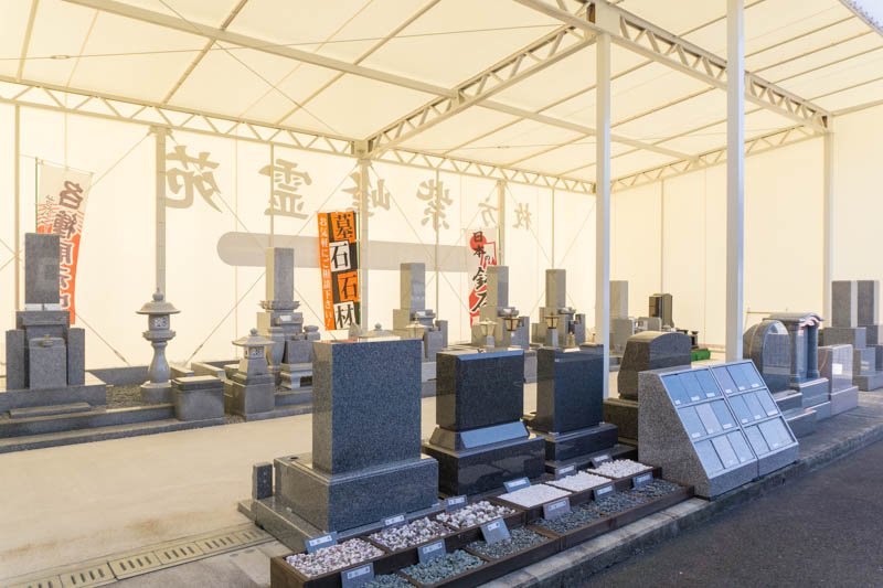 お墓の見本もすぐに見られるのは手間も省けて嬉しいですね。お墓を見守る約10mの観音様