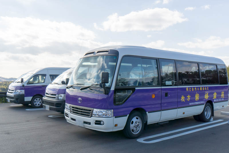 コチラの送迎バスは、枚方市駅・長尾駅・松井山手駅・新田辺駅の各駅と紫峰霊苑間を定期的に運行(毎週水曜日と年末年始は運休)。施設内もバスで移動することができます。