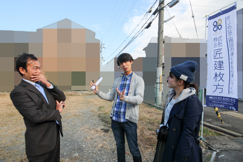 注文住宅を建てるのが夢だった夫婦(設定のカトゥー&ばばっち)が緊張のあまりカチンコチンになって訪れたのは、招提元町にある匠建枚方(しょうけんひらかた)。