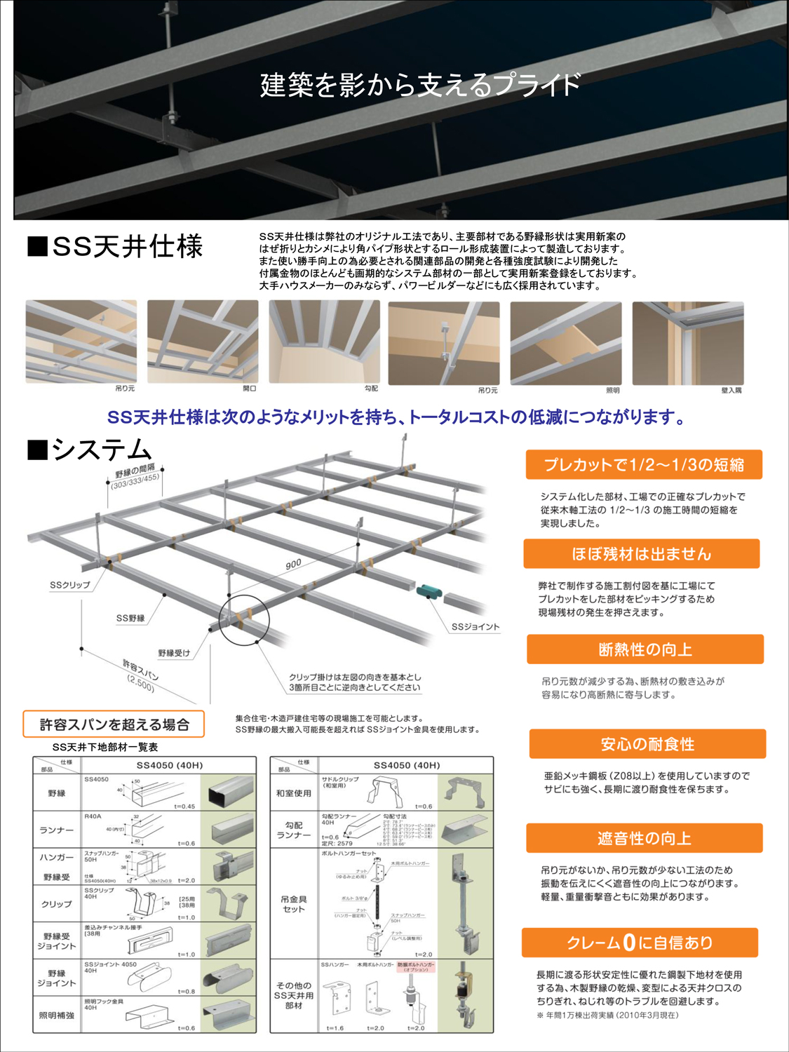 この天井は「SS天井仕様」という建築を影から支える大切な役目をします。断熱性や遮音性があがり、天井クロスのチギレやねじれを抑える効果のある、天井下地材なんです。