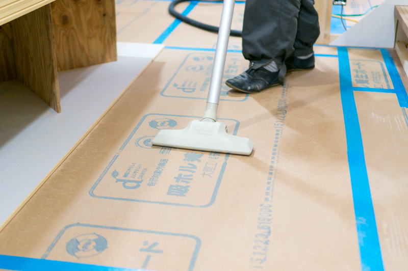 ホウキでの掃き掃除だけではなく業務用掃除機をかけて現場をキレイに保たれています。