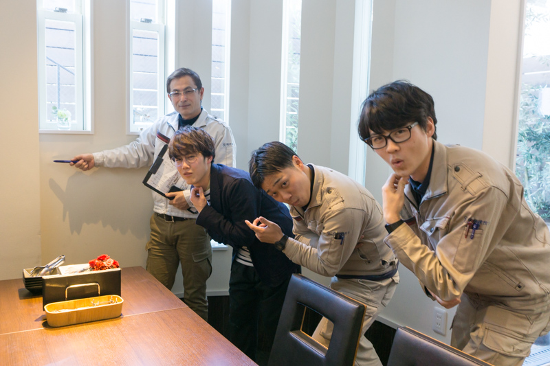 匠建枚方の若手三銃士の左からモリー・ニッティー・カネコンは、建築学部の同窓生。モリーとカネコンはそれぞれ異なる大学院に、ニッティーは大手ハウスメーカーの建築会社へ進みましたが、数年後、森井を起点に匠建枚方へ再集結。森井は設計部、金子と新田は工務部。建築を学んだ知識をもとに仕事に前向きに取り組み、すでに大活躍してくれているそうですよ。