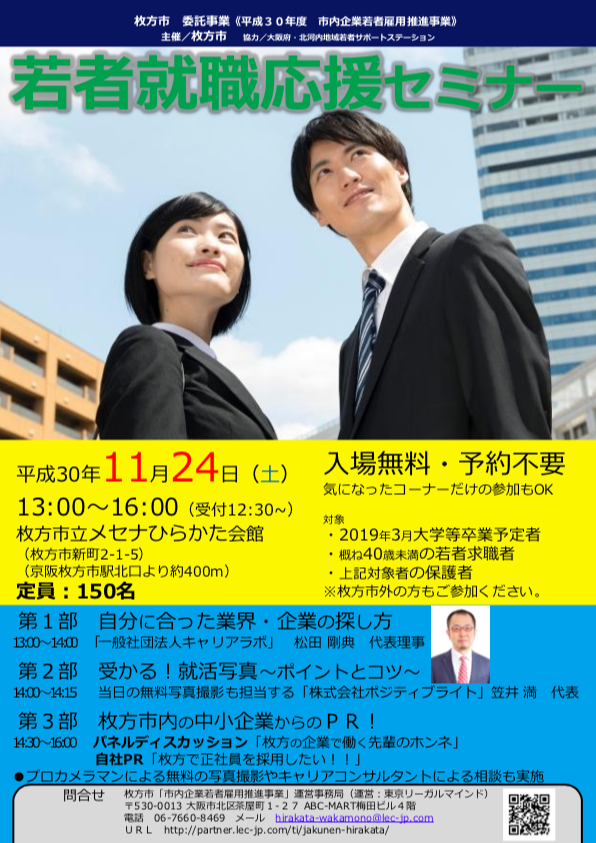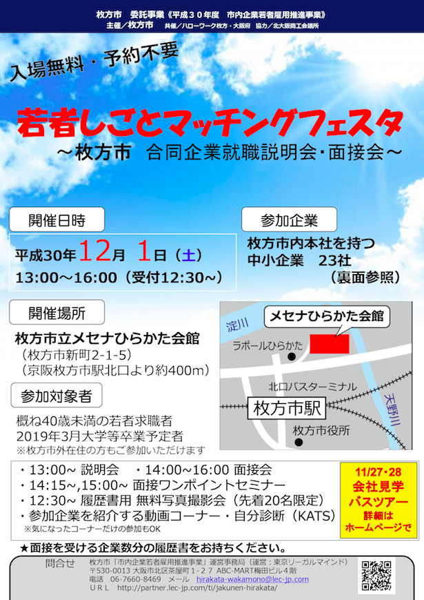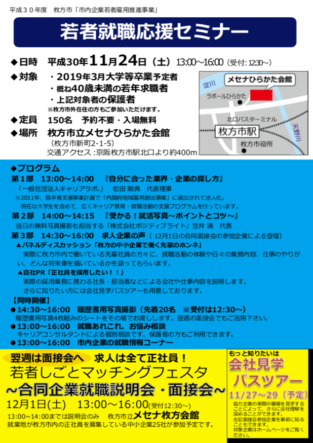 今年は保護者向けセミナーや会社見学バスツアーも増えて4つのイベントが開催!12/1には枚方の優良企業と若者をつなぐ合接&面接会も【ひらつー広告】