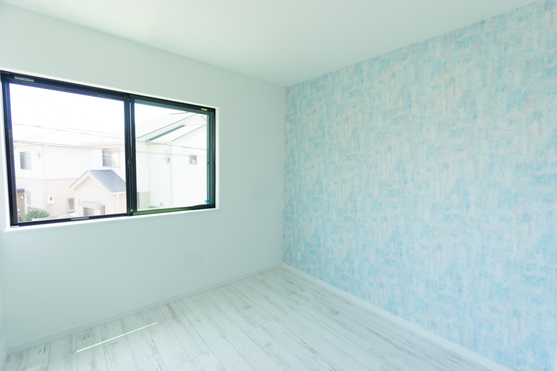 向こう側に見える、ブルーのアクセントクロスが貼ってある洋室では、ご主人が好きな音楽やギターなど趣味の部屋として使う予定だそう。