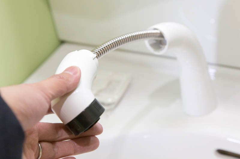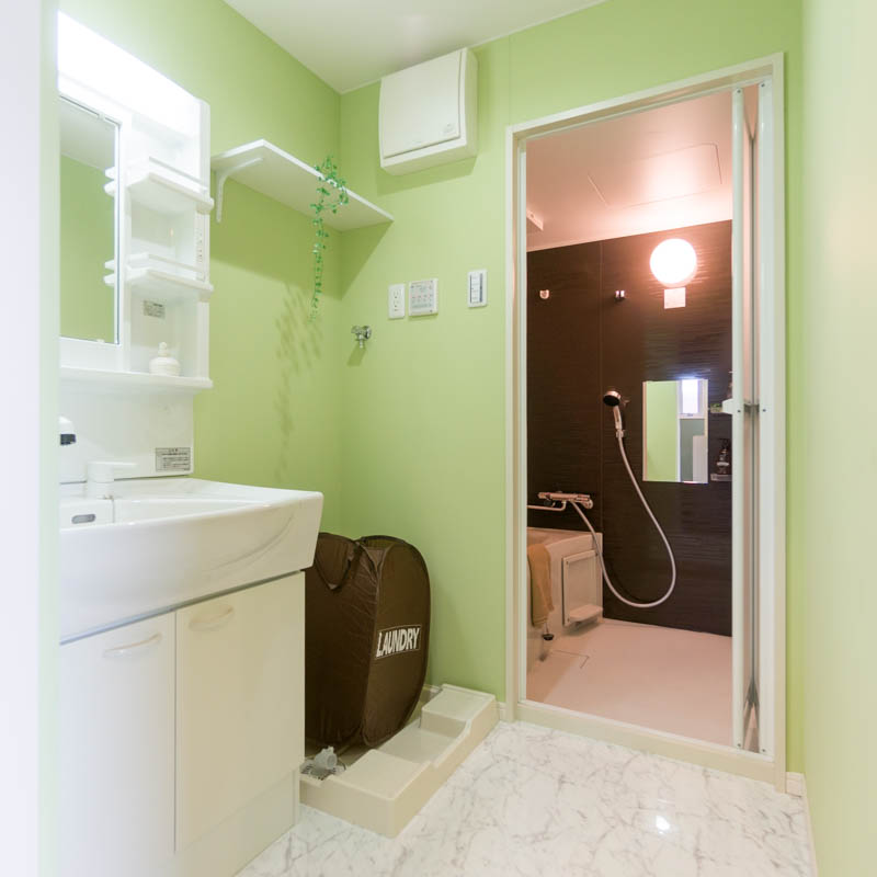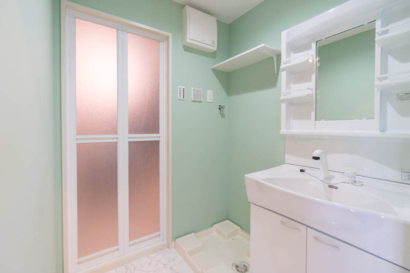バス・洗面スペースの壁は少し緑がかったライトブルーに。
