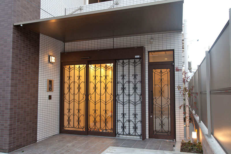 装飾された格子の扉はなんと自動ドア!いきなりオシャレですね!