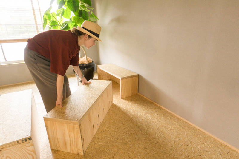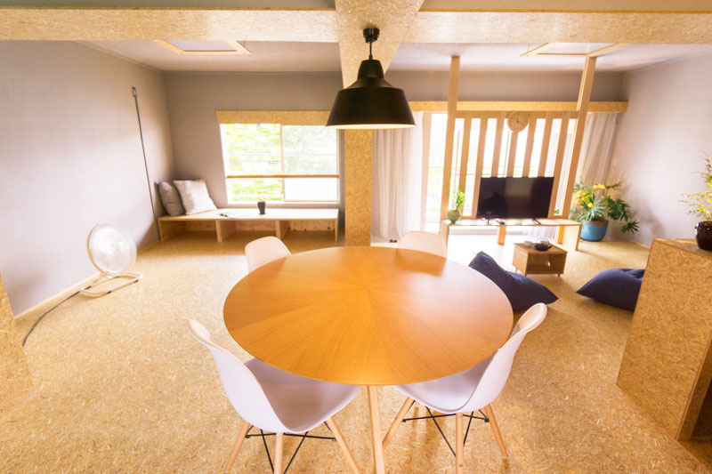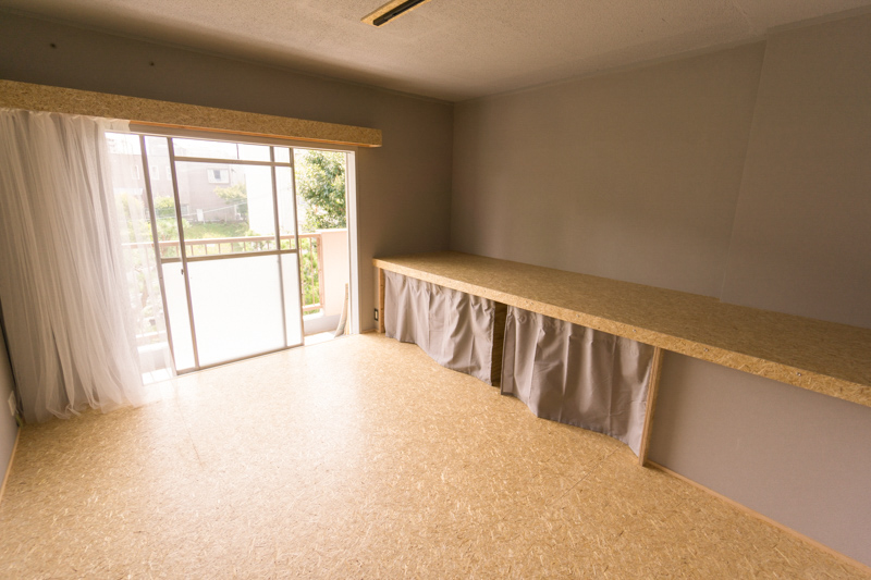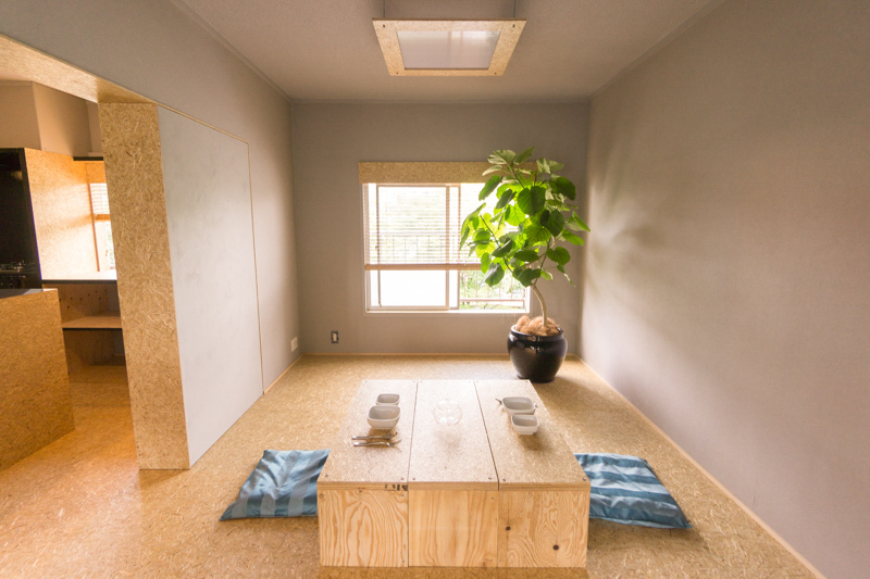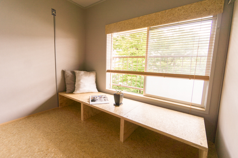 その隣の部屋には麦わらボードをつかったベンチ(ローテーブルとしても使えそう)が備え付けてあります!!