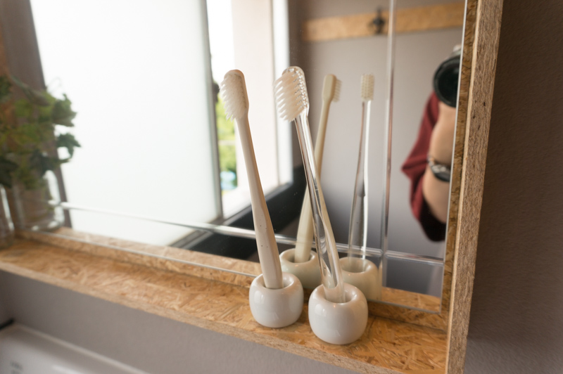 洗面台の鏡の縁には歯ブラシなどが置けます。
