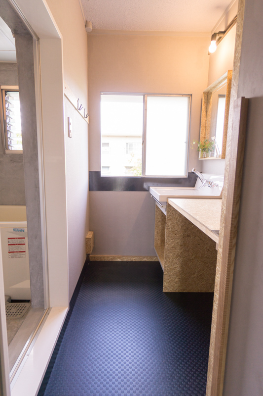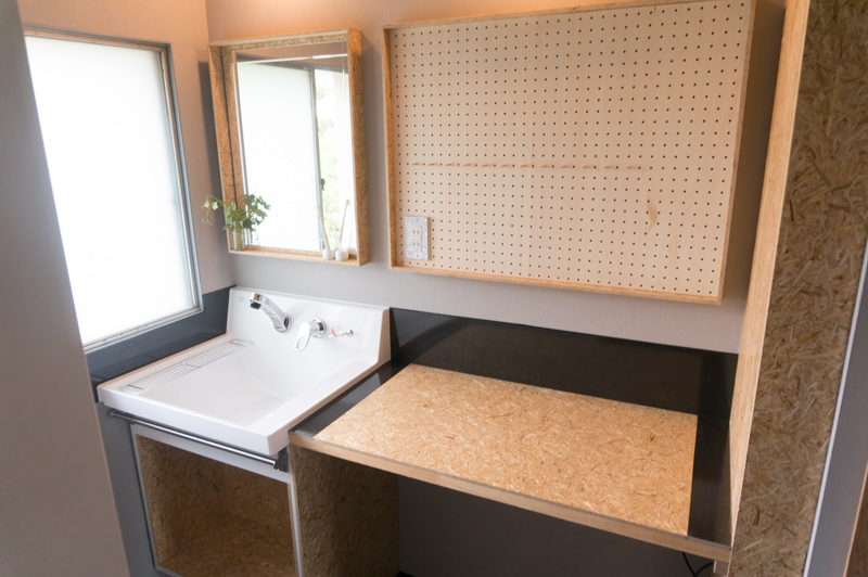 3.有効に使える有孔ボードがある洗面室。