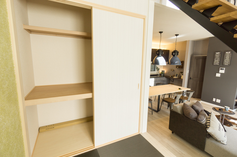 左奥にはかさ張るふとんをどかっと入れられるスペースもあります!「ままおぴ(ママからの意見)」がふんだんに取り入れられていて使いやすいお家です。