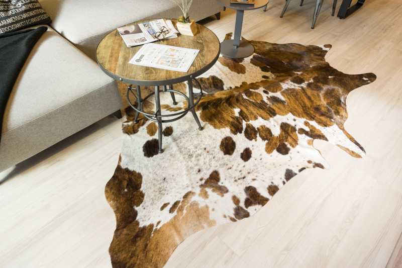 「これね、数日前に届いたところなんです。本物の牛さんの皮のじゅうたん。いいでしょー??!!」