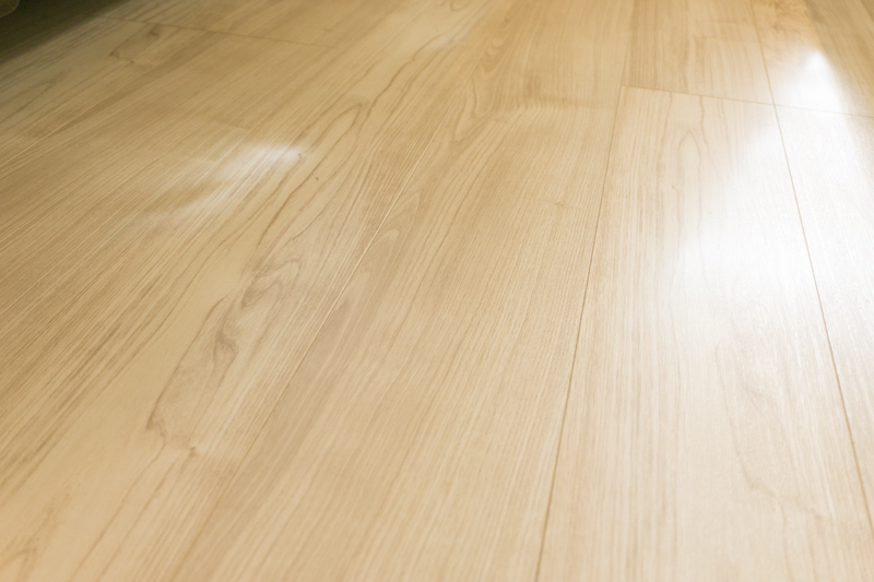 「これ、壁紙なんですよ。本物の木材みたいに見えるでしょ?最近は技術が上がってきて質が高いものが増えているんですよ。」