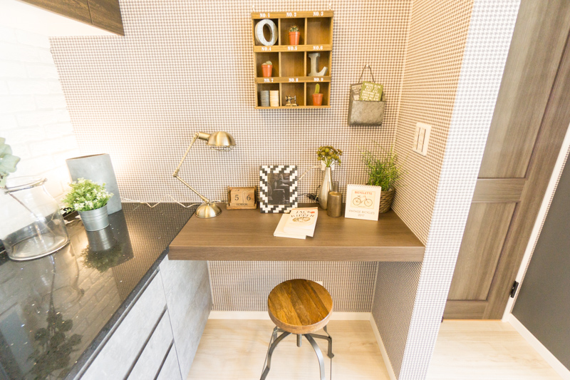 キッチン横にはちょっとした作業スペースも。ママの家計簿整理場所・子どもの宿題の場所・パパの仕事場…いろいろと使えそうです◎