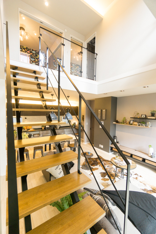 「このストリップ階段も特注品です!こだわったわ〜。これがもしがっつり全面が板で被われていたり、金属部分がもっとごっつい階段だったら、この抜け感は実現できないですよね。」