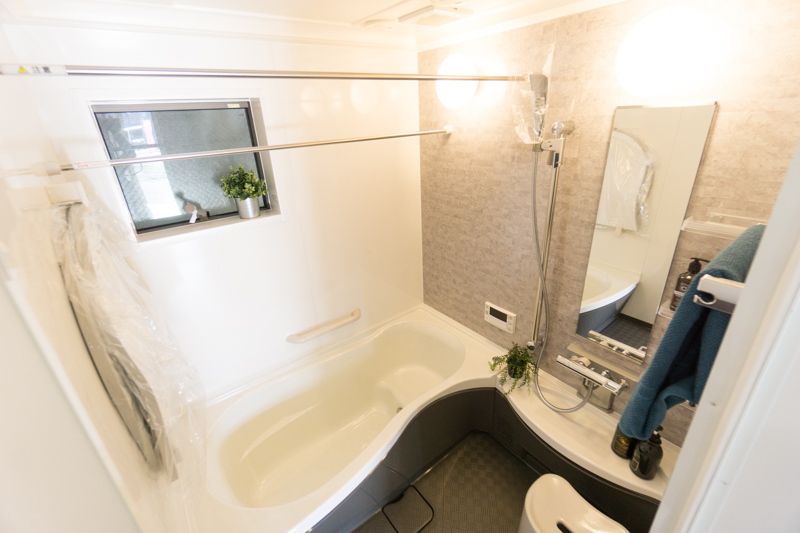 珍しいグレーを基調にした浴室。汚れが目立たなくてよさそう!洗濯物が干せるように2本も物干し竿がついているのも機能的です。