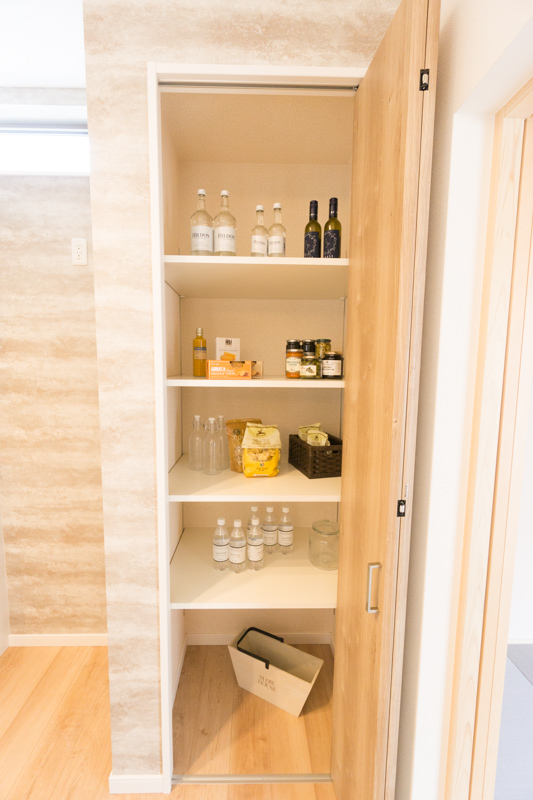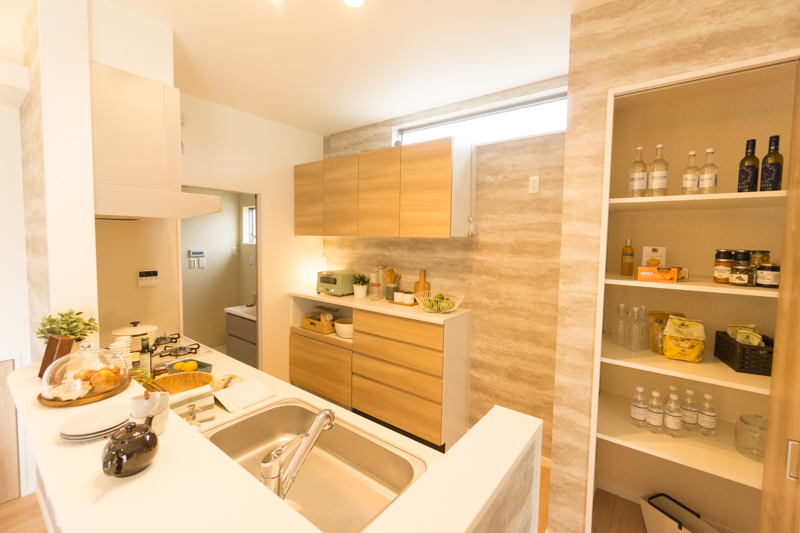 こちらのお家もカウンターキッチンになっており、大きなパントリーがあります。食器や保存食の収納に便利!