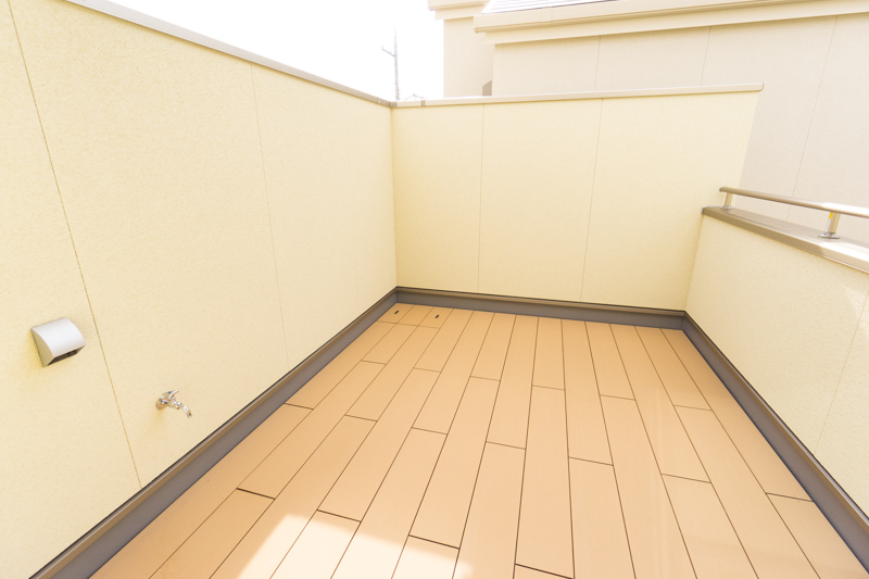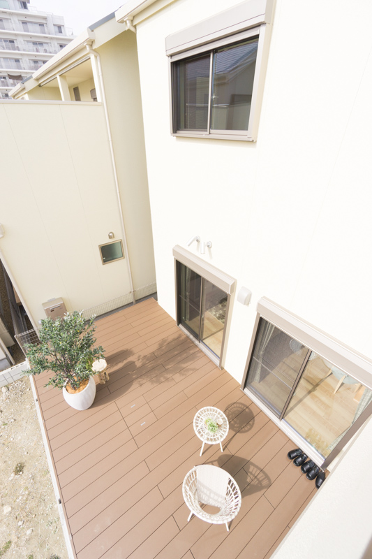 壁に囲まれ、リビングの延長として利用できる、半屋外空間のウッドデッキ!