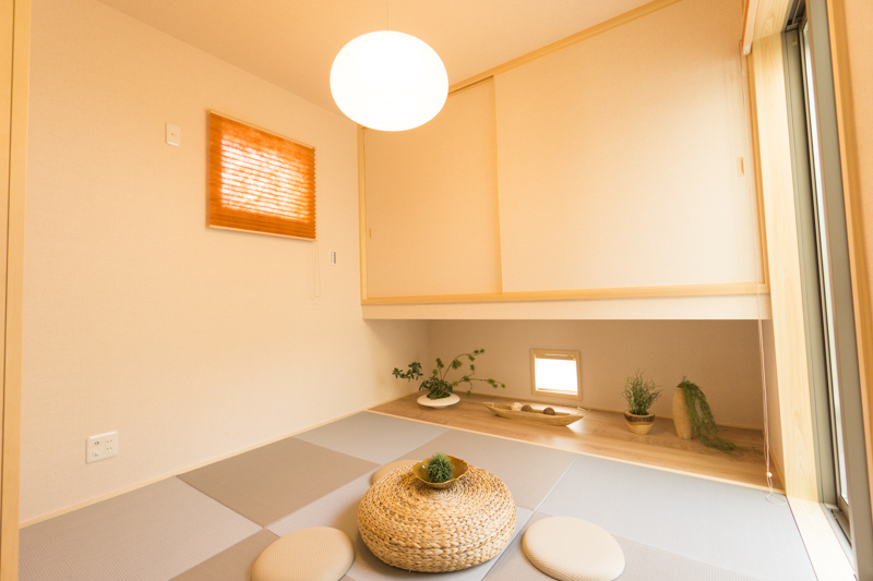 和室の窓からも直接ウッドデッキに出ることが出来ます。目に優しい照明です。