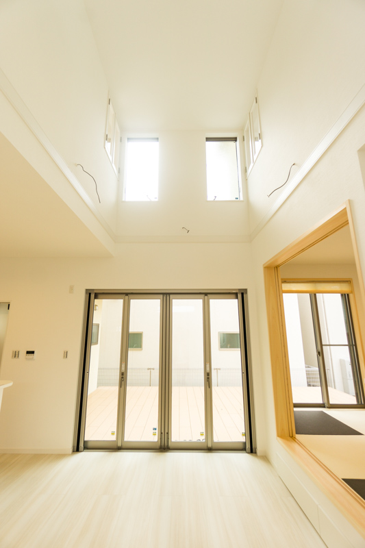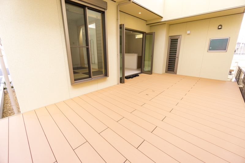 大きな南向きの窓の外は、こんなに広いウッドデッキになっています!!窓を開ければリビングの延長としてひろびろ楽しめます。奥のお家がまだ出来ていませんが、ゆくゆくは家が建ち、壁に囲まれた半屋外空間になります。