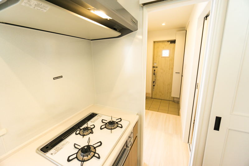 中に入ると二手に分かれており(引き戸で開閉できます)左がキッチン、右がリビング&ダイニングになっています。