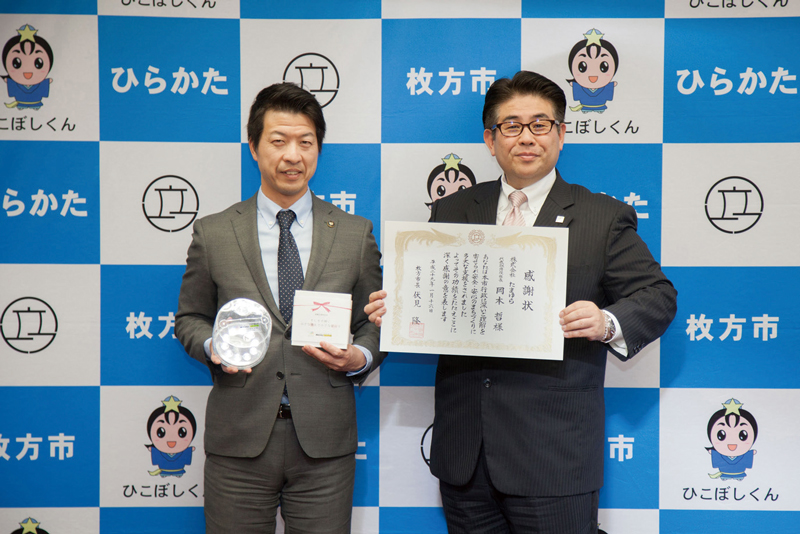 伏見市長(写真左)からLEDランタン寄贈の感謝状を受け取るたまゆらの岡本哲社長(写真右)