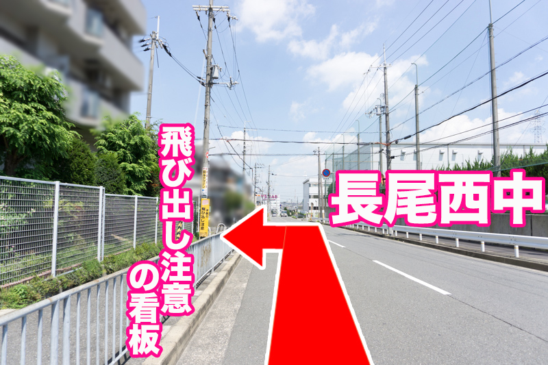長尾西中の西側の道路を北に進み「飛び出し注意」の看板を左折します。