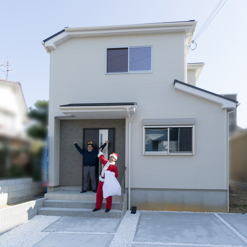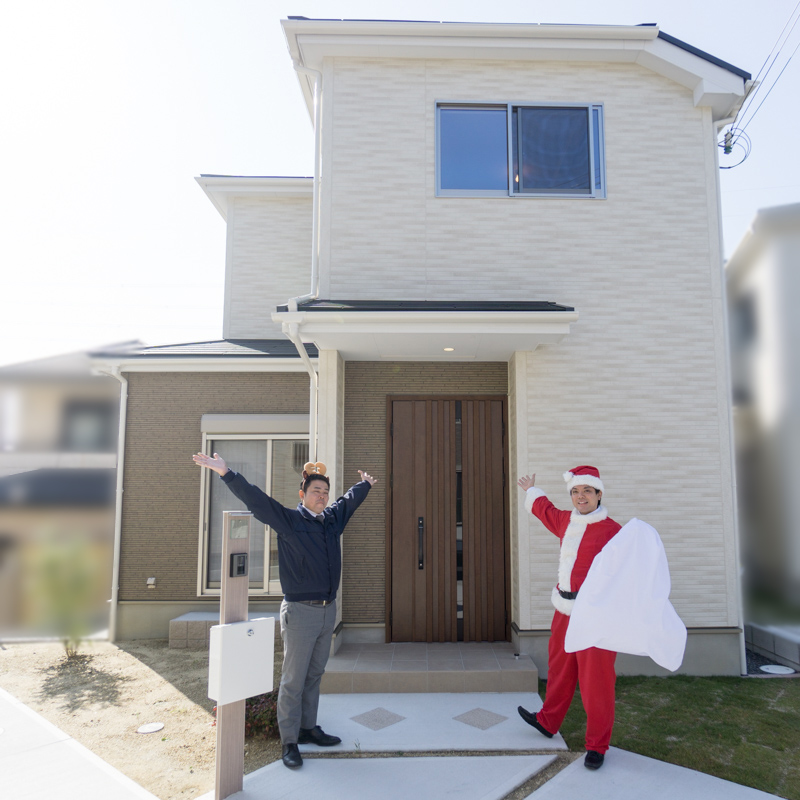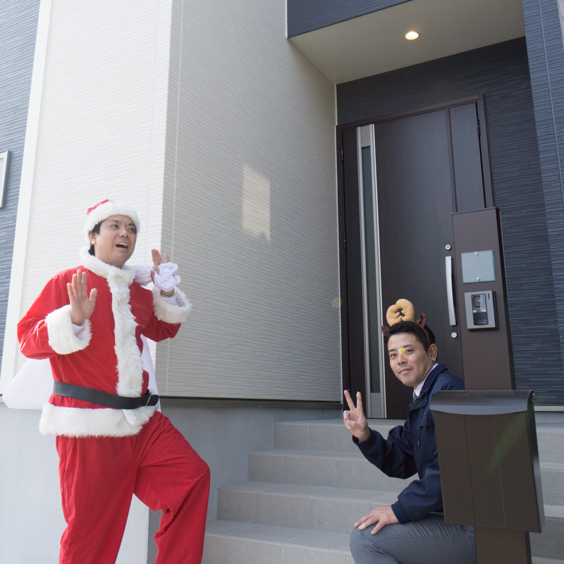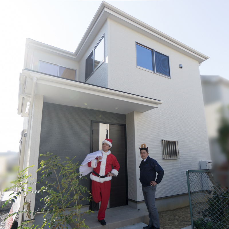 だから、その疑問を発端として、買主様の仲介手数料をゼロ円にする『ちょっと待った!! 新築仲介』ってサービスをはじめたんやって!ちょっとサンタの帽子、引っ張らんといてーや!課長になったのは関係ないって〜♪(ルンルン)