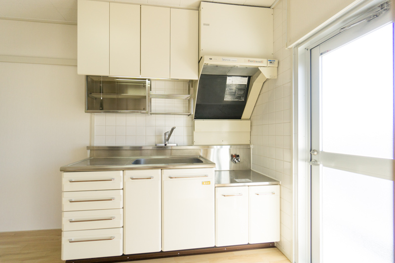 白を基調にしたシンプルなデザインのキッチンの横にはバルコニーにすぐ出られるドアがあります。