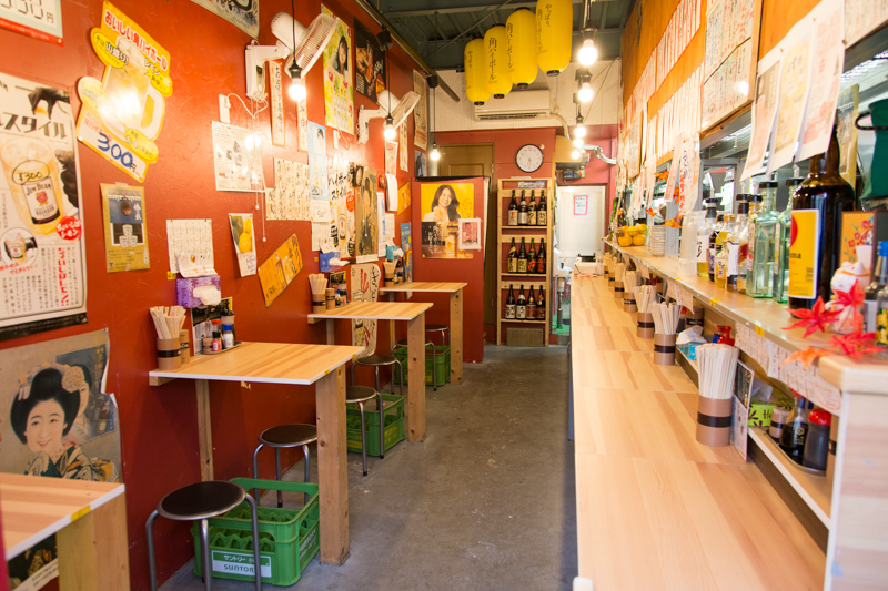 奥から入口を向いて。カウンターとテーブル席があり、混雑時は立ち呑みになります。