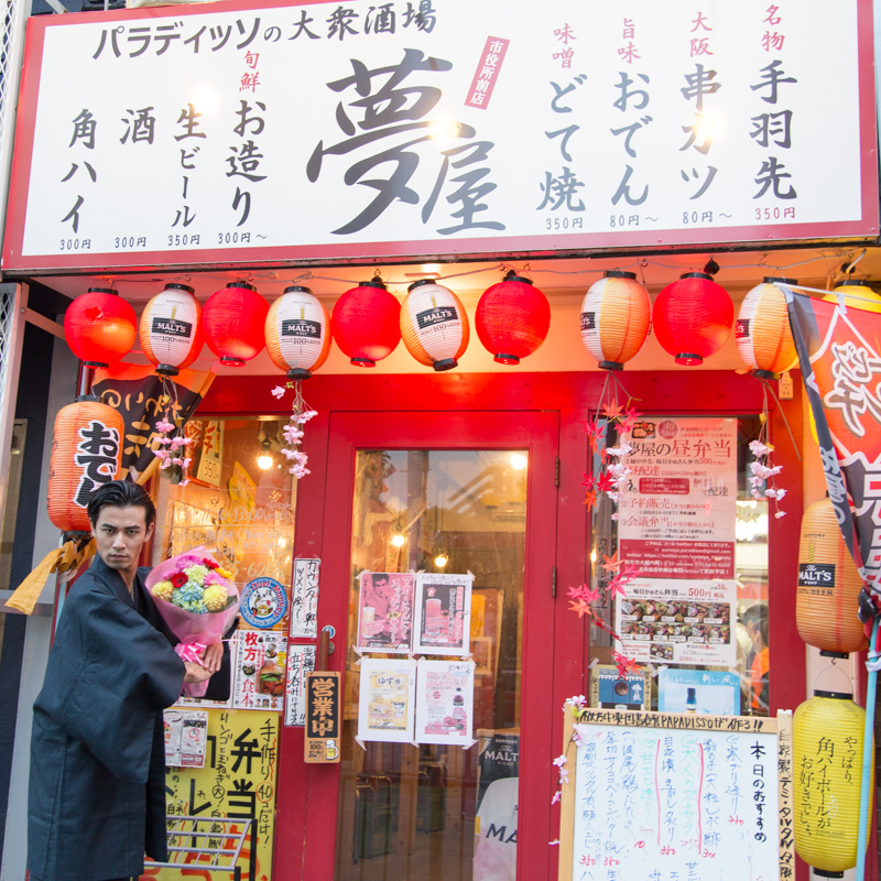 かた男がやってきたのは枚方市役所の交差点近くにあるド大衆酒場「夢屋」