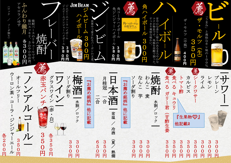 うちのメニューは全100種類以上!美味しい!! 安い!! 多い!! の三拍子やで。どうせ迷うから料理も適当に出したるわ。