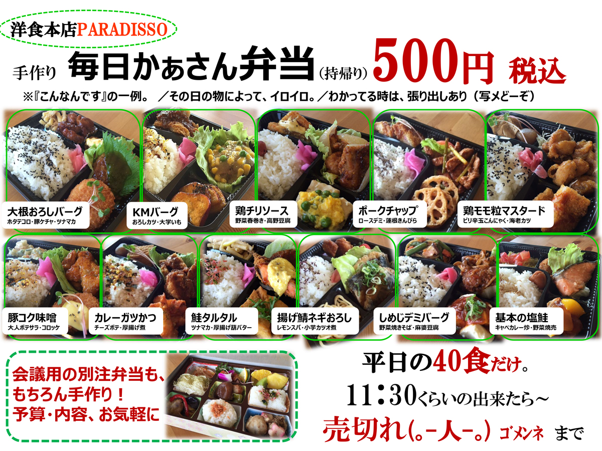一日40食限定!のお持ち帰り弁当は税込500円!(※TEL予約可:070-5435-6266)