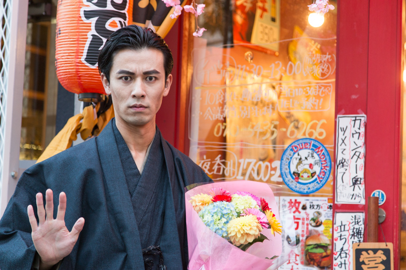 花束のプレゼントを渡すナイスガイは枚・かた男だよ。