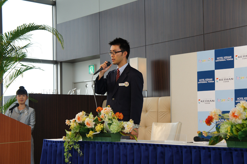 会見が行われたのはユニバーサルシティ駅を降りてすぐのところにある「ホテル京阪ユニバーサルタワー」(写真左)。京阪のホテルではありますがユニバーサルスタジオのど真ん前です(笑)