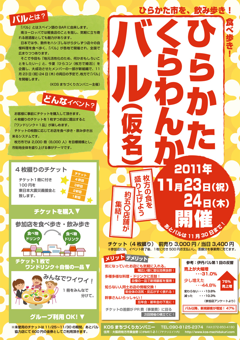 このイベントは枚方つーしんも「おもろいなー」と思って運営に加わらせてもらってるので後日チケット販売のお知らせもしますが、今回は参加店の募集です。参加店のメリットとしてはもちろん「お客さんが増える」というのが一番大きいと思いますが、参加店は枚方つーしんで数店舗ずつ紹介する予定なので最低でも認知度アップにつながります!
