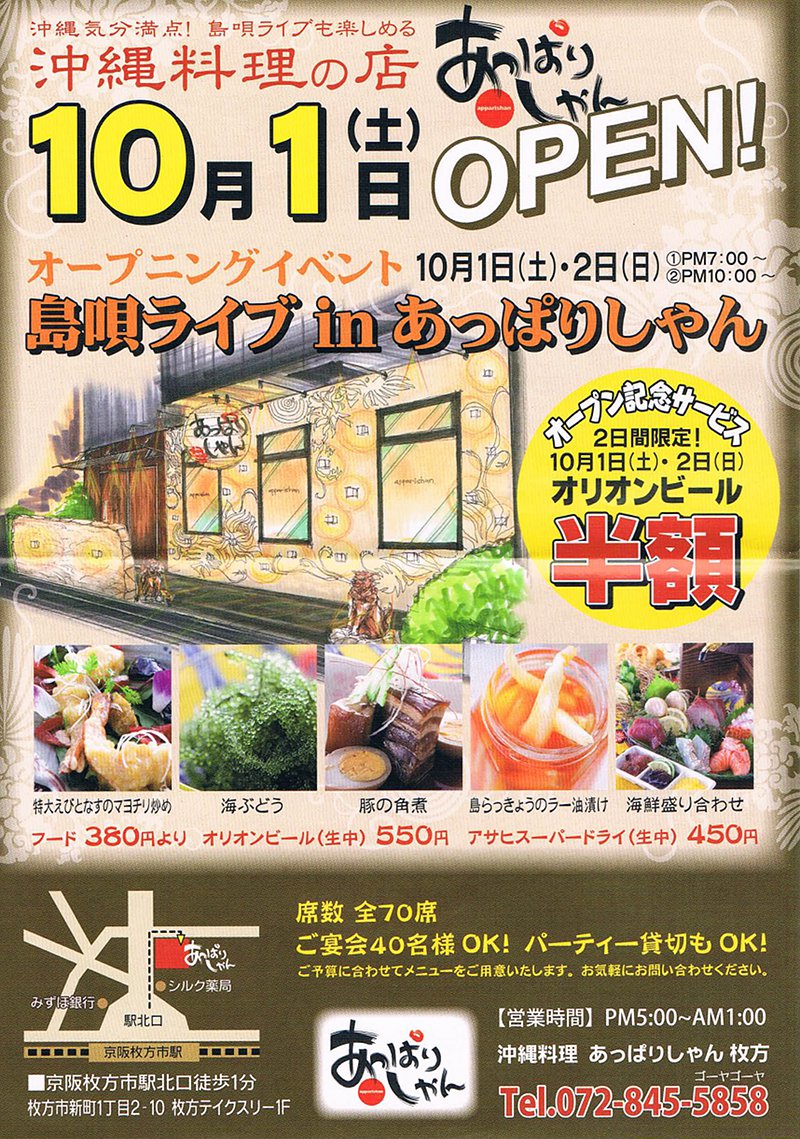 枚方市駅北口に「あっぱりしゃん」って沖縄料理店がオープンしてる