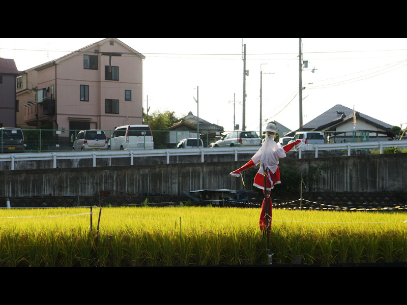 これは私の田んぼです。雀が多く稲穂を食い荒らすので普通の案山子では効果なし、そこで一計を案じジャンボ案山子の登場と相成ったわけです。3メートルはあるかも・・・。お陰で今年は雀さん恐れをなして退散した様子。でも来週水曜日ごろ刈り取りでお役目ゴメンとなります。ところでこのサンタの衣装は老人施設にボランティア訪問して懐メロを歌う時の衣装で古くなってお払い箱の衣装です。注目されて彼(サンタ案山子)も満足かな????
