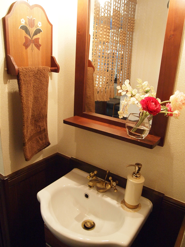 こちらトイレのそばの洗面台。タオル掛けもトールペイント。
