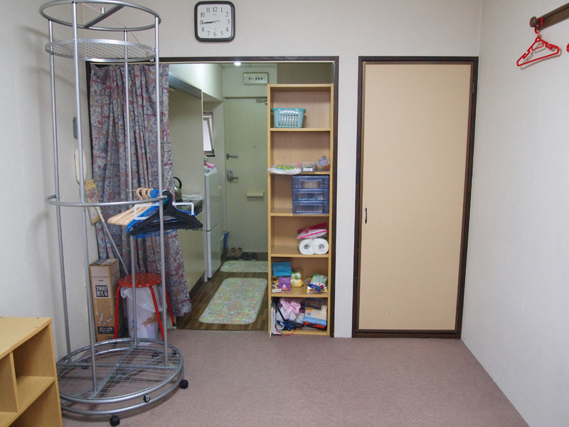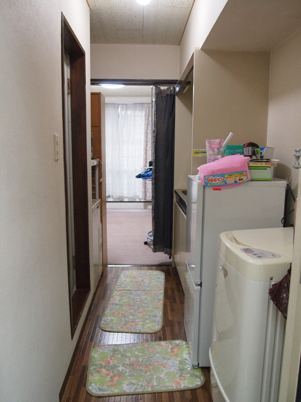 キッチンの方から玄関の方。冷蔵庫の向かい辺りに何やらドアが。
