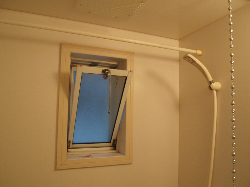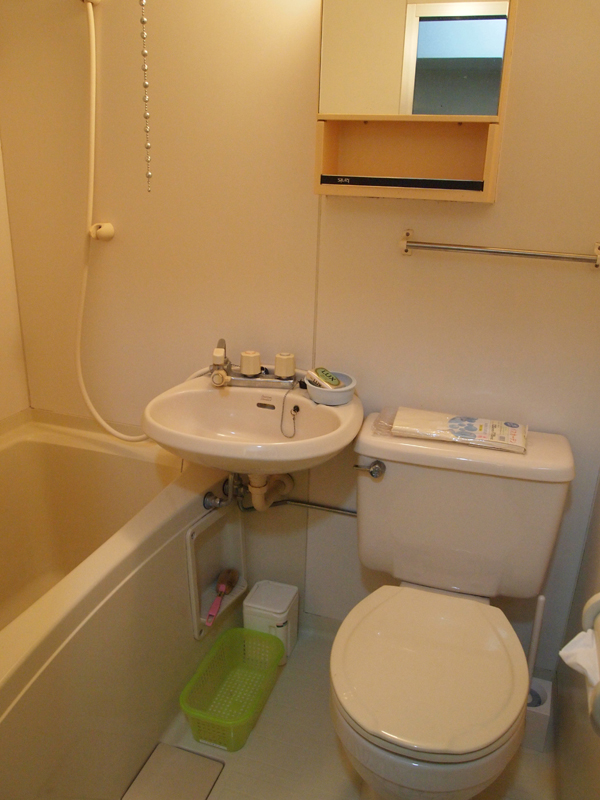 お風呂とトイレが一緒のユニットバス。よく見ると、シャワーカーテンなどが用意されています。