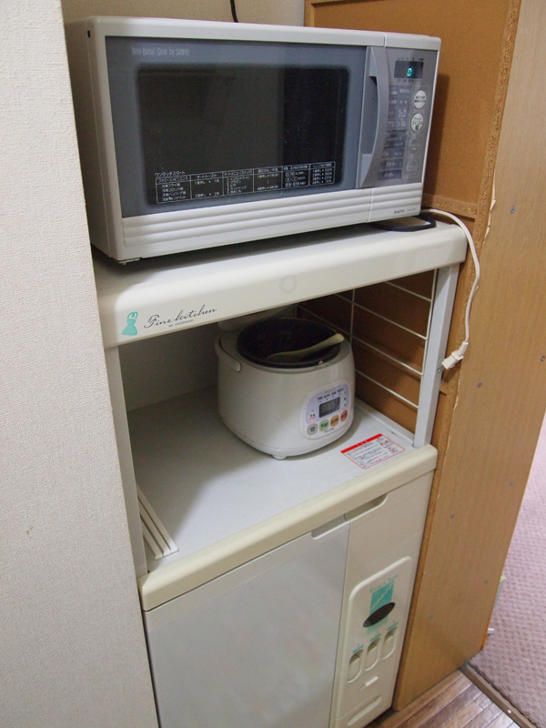 キッチンの向かいにはライスストッカー付きのキッチンボード。なんと電子レンジと炊飯器も完備!