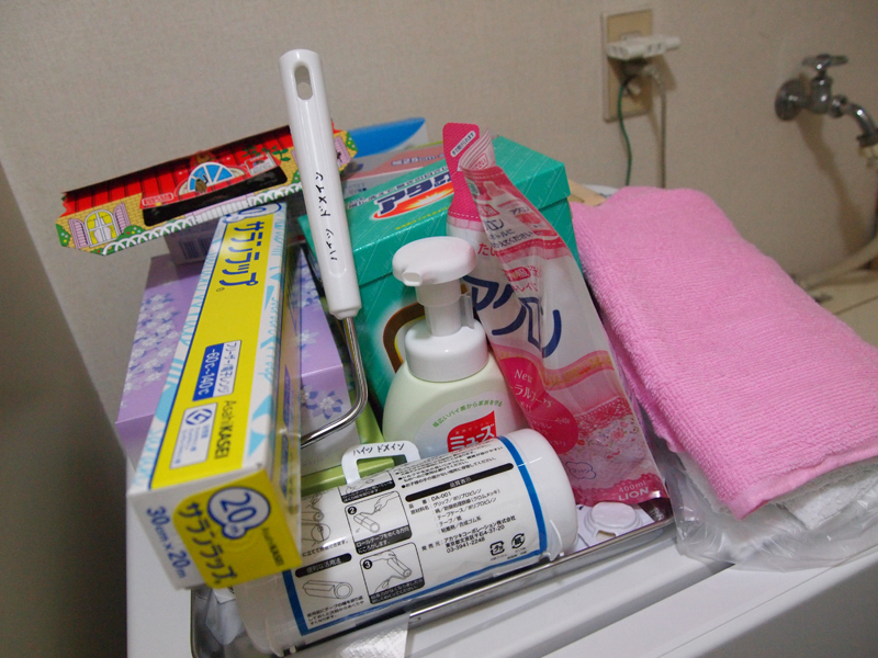 その上にはサランラップや洗剤類、コロコロにゴキブリホイホイまで!